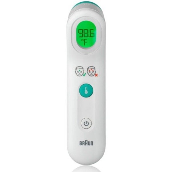 The Braun forehead thermometer has professional accuracy with a gentle touch. It is quick and easy to use and also has a large, easy to read screen. The temperature guidance changes the backlight from green to yellow to red depending on the temperature reading. 1) Ergonomic for both mom and child, 2) For infants, children and adults, 3) Reads in Fo and Co.; White.